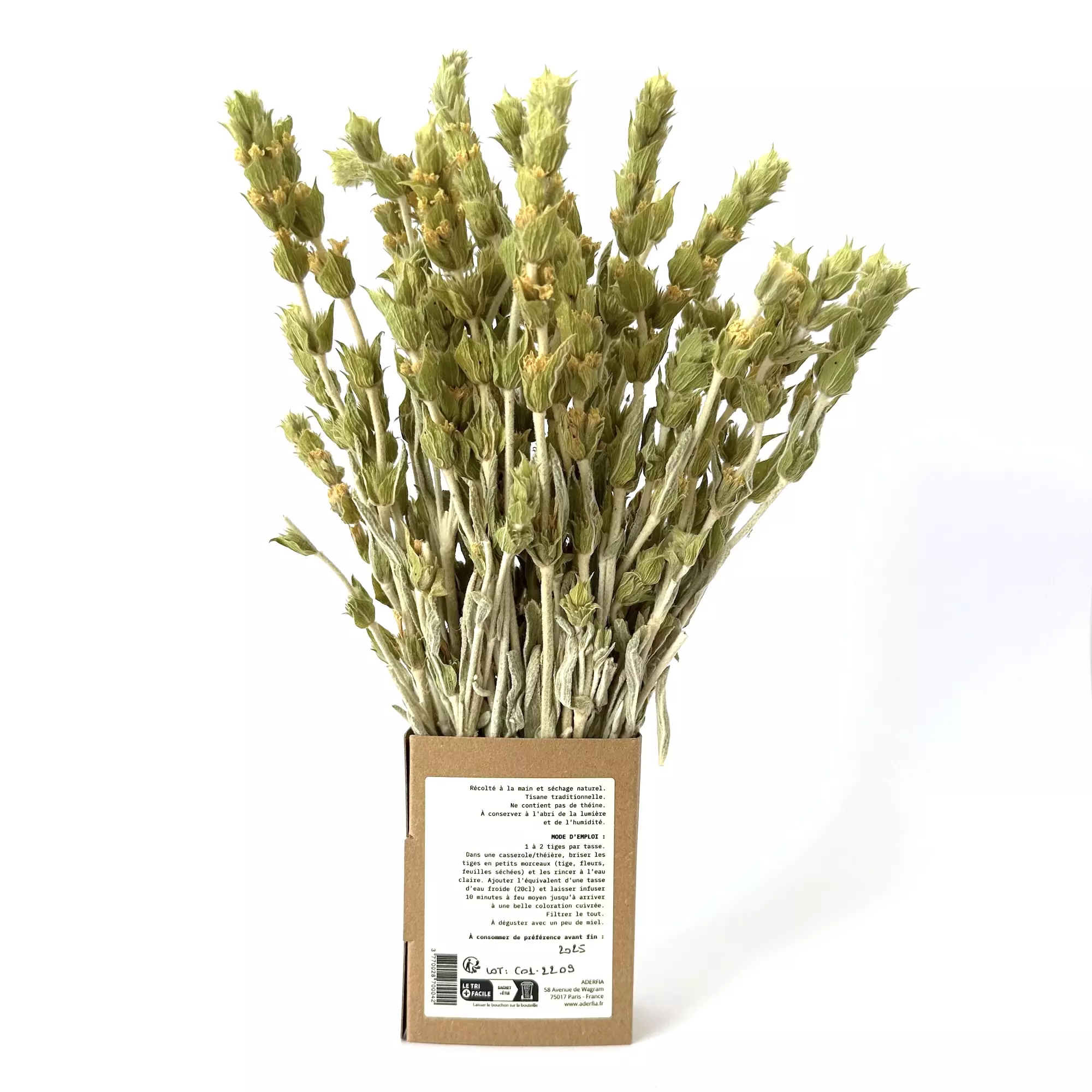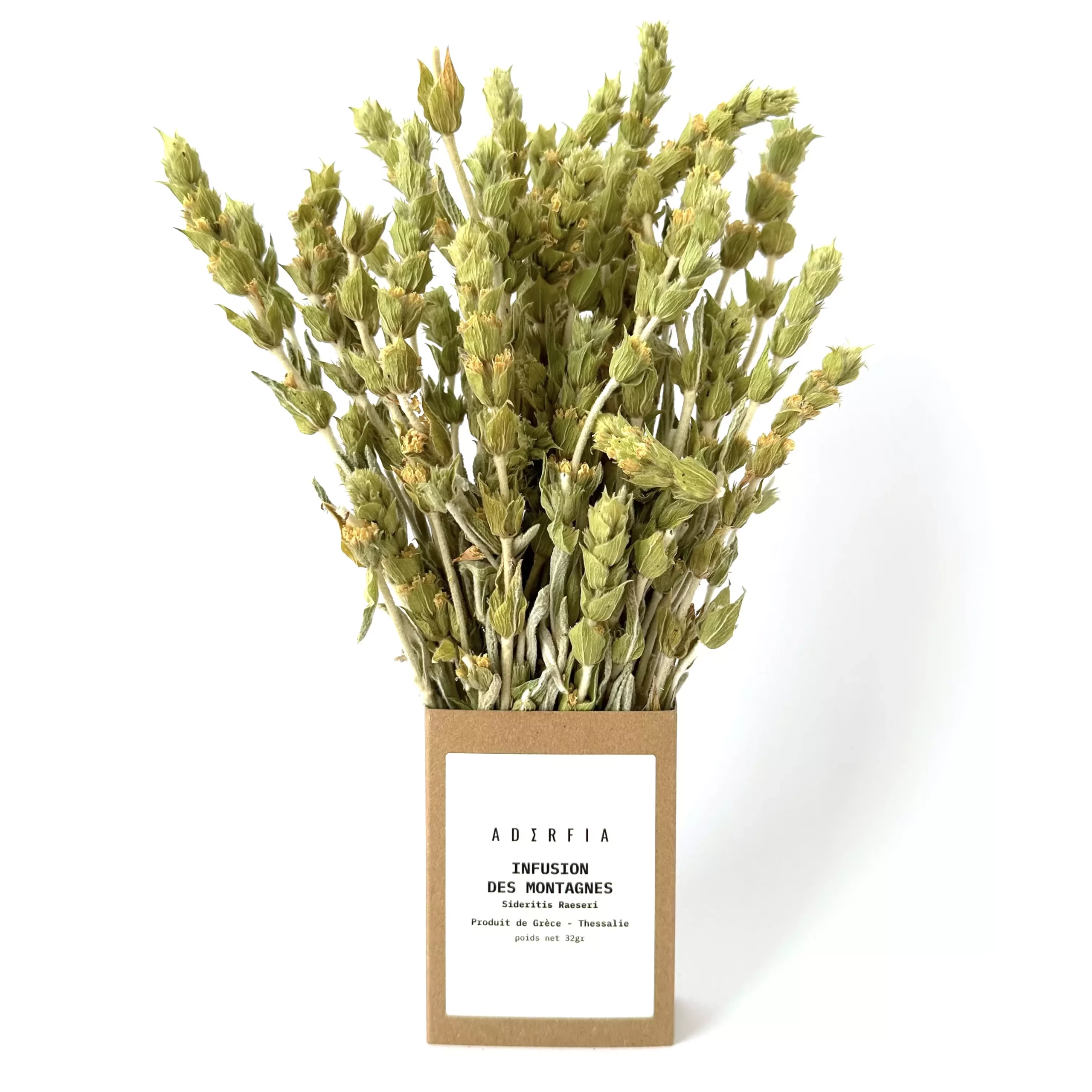 Dénomination : Infusion Des Montagnes – Sideritis Raeseri Origine : Grèce - Thessalie Poids net : 32gr Prix au kilogramme : 137.50 euros Date de durabilité minimale : 18 mois Conditions de conservation : à conserver à température ambiante, à l’abri de la lumière et de l’humidité.