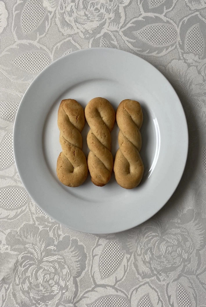 Diviser la pâte en 15 portions (environ 40gr chacune). Pour chaque portion, former un boudin de 15cm de long, le plier en deux et tordre les extrémités ensemble. NB. Vous pouvez également façonner les biscuits en spirales ou en forme de « S ».