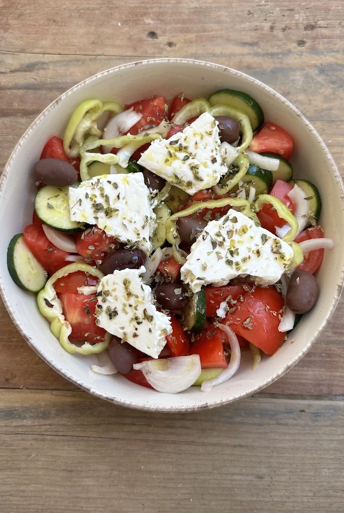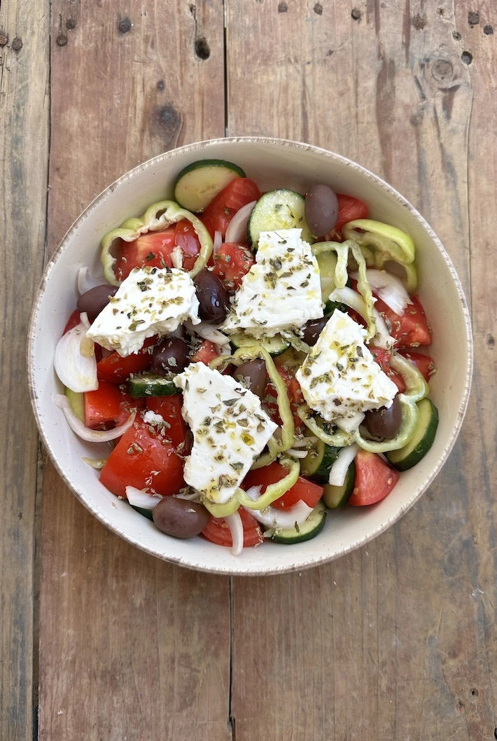 Placer le bloc de feta par-dessus la salade, sans le briser (ou bien l’émietter, au choix).
